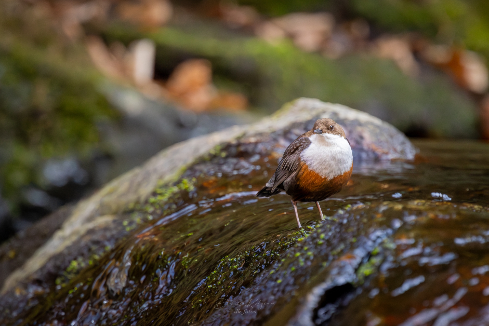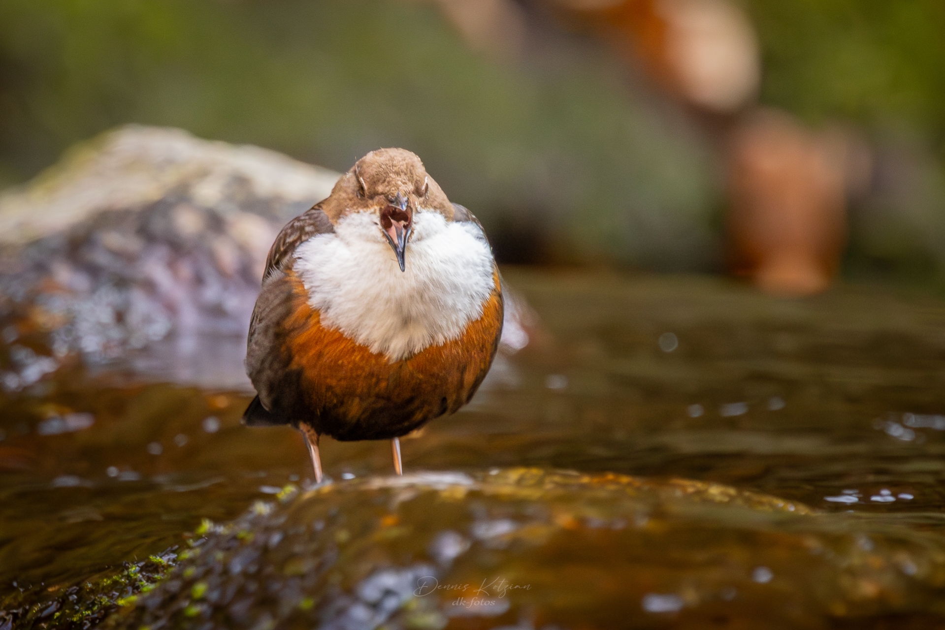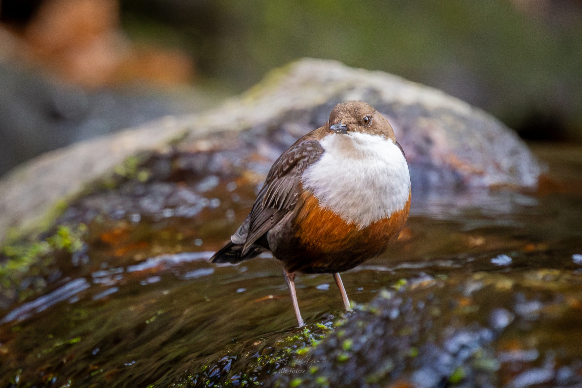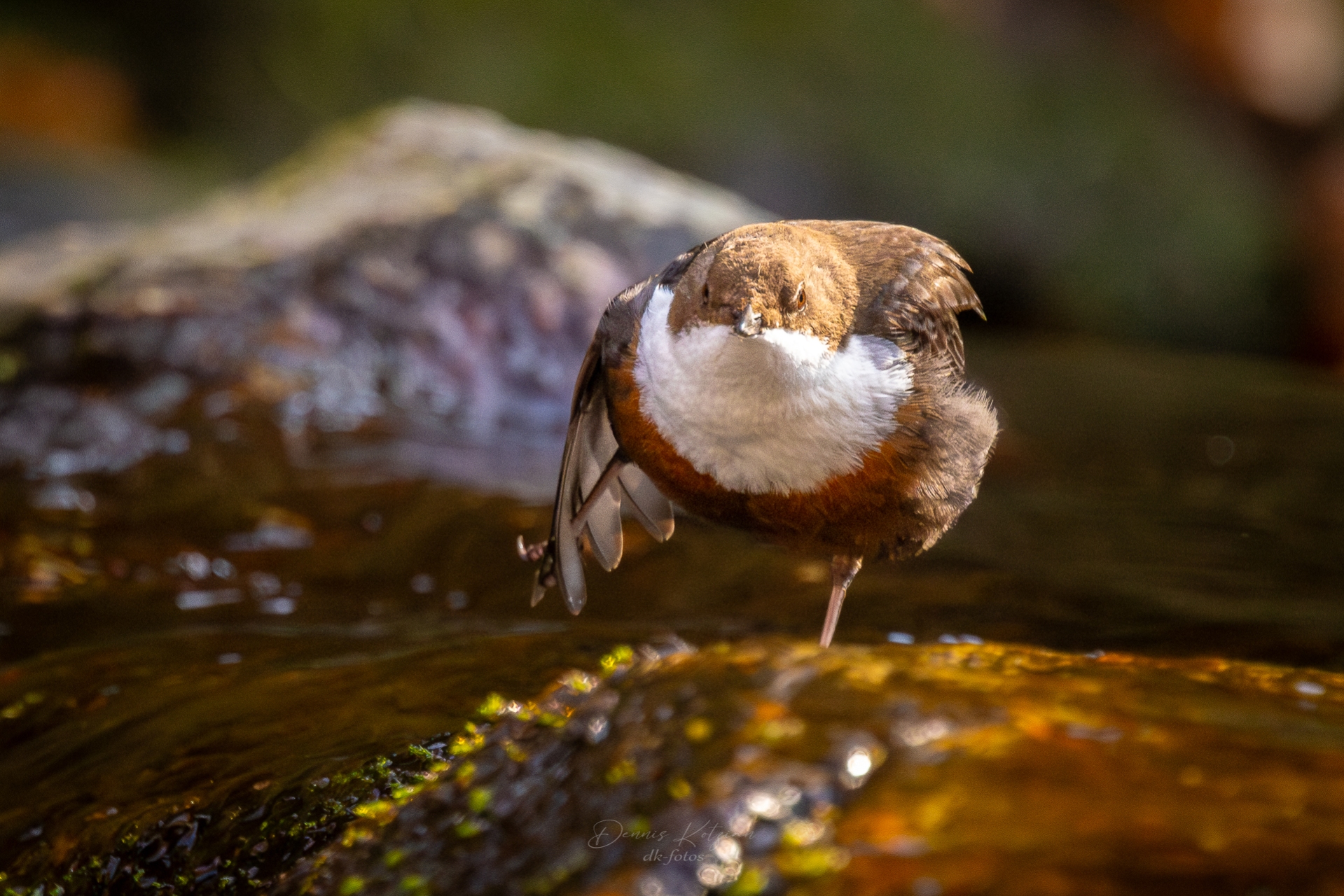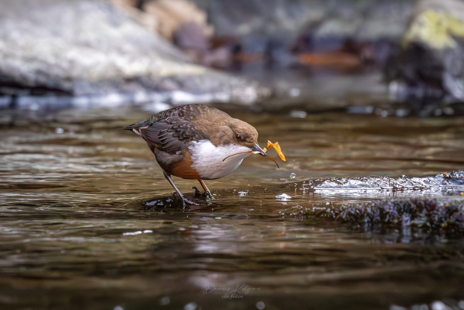 Mit ihrem schokoladenbraunen Gefieder und der markanten weißen Brust ist sie oft beim „Knicksen“ auf Steinen zu beobachten. Von dort springt sie ins Wasser, um am Grund nach Insektenlarven, Köcherfliegenlarven und Flohkrebsen zu suchen.