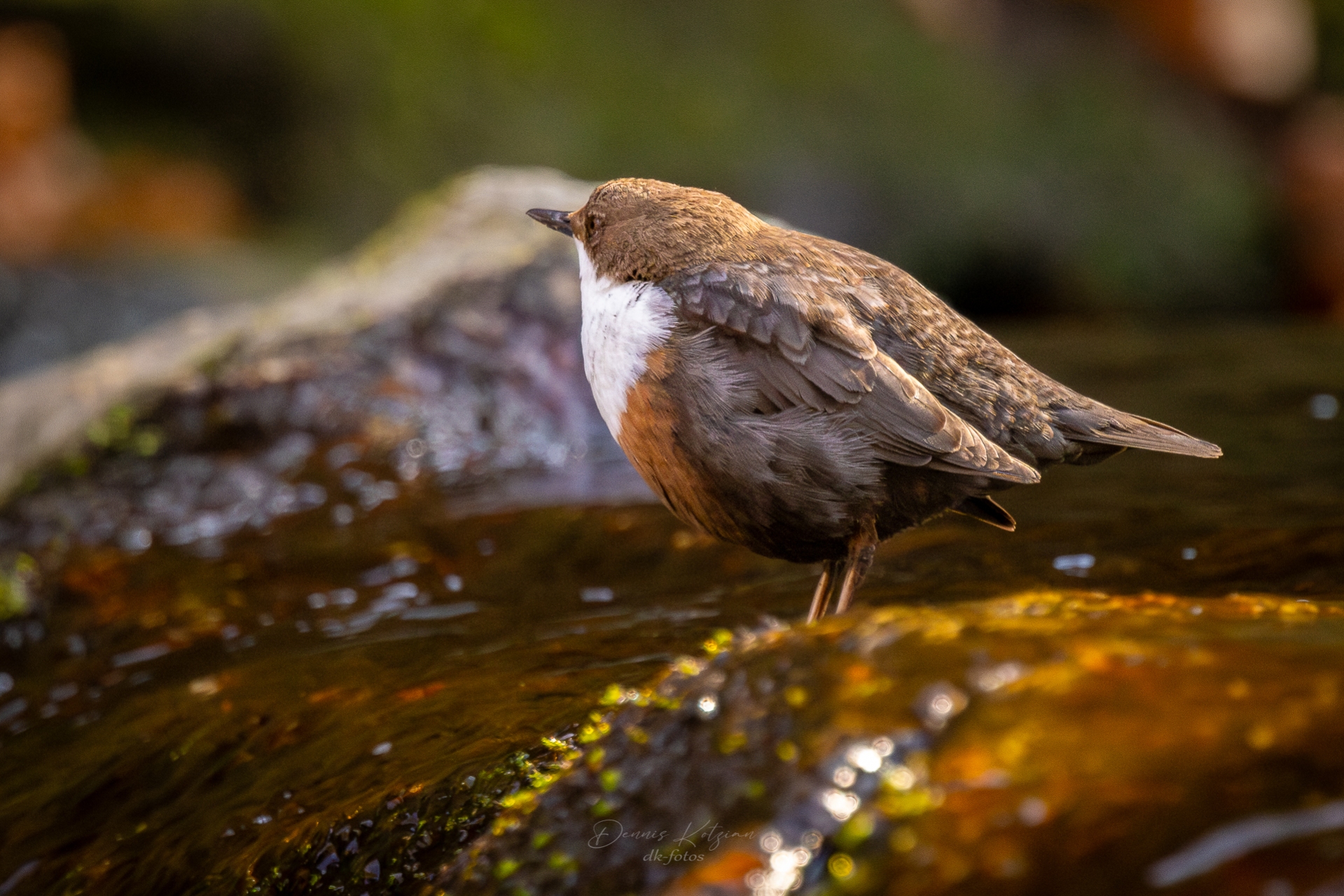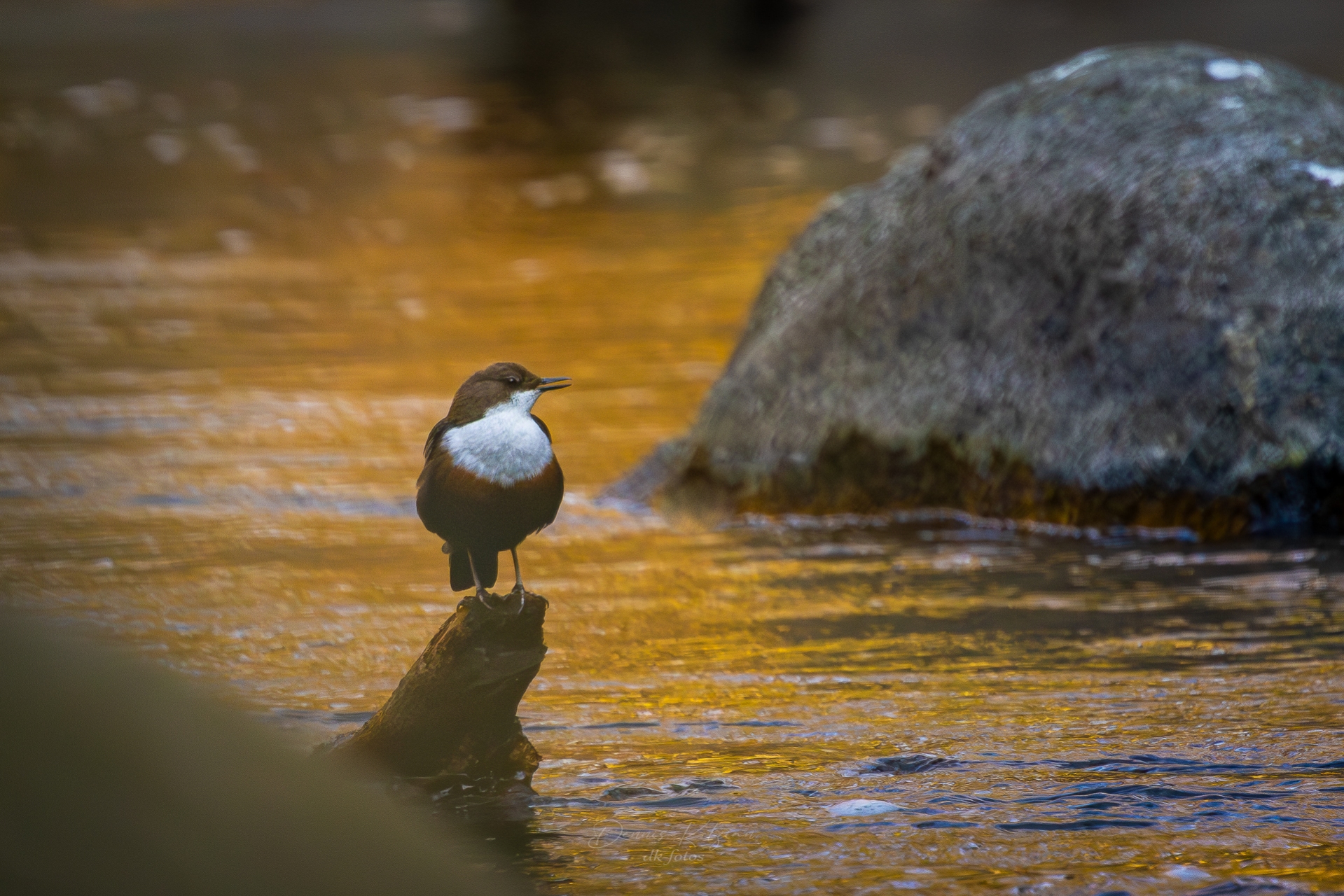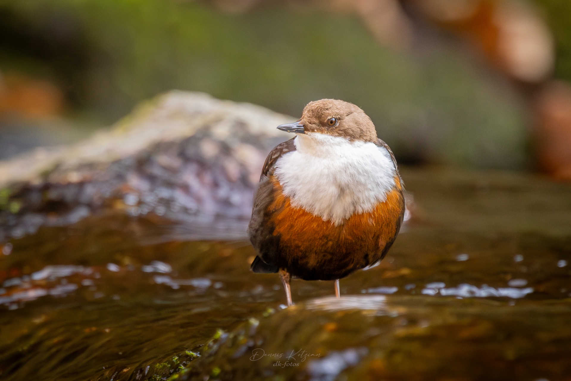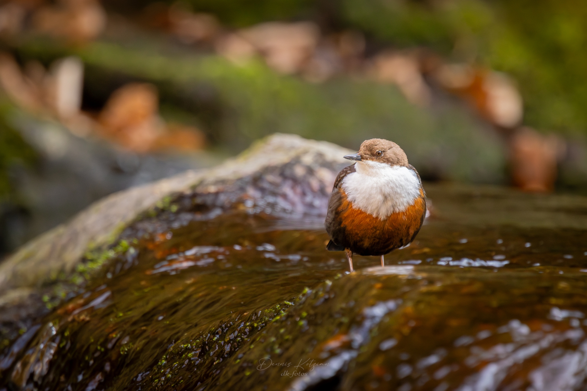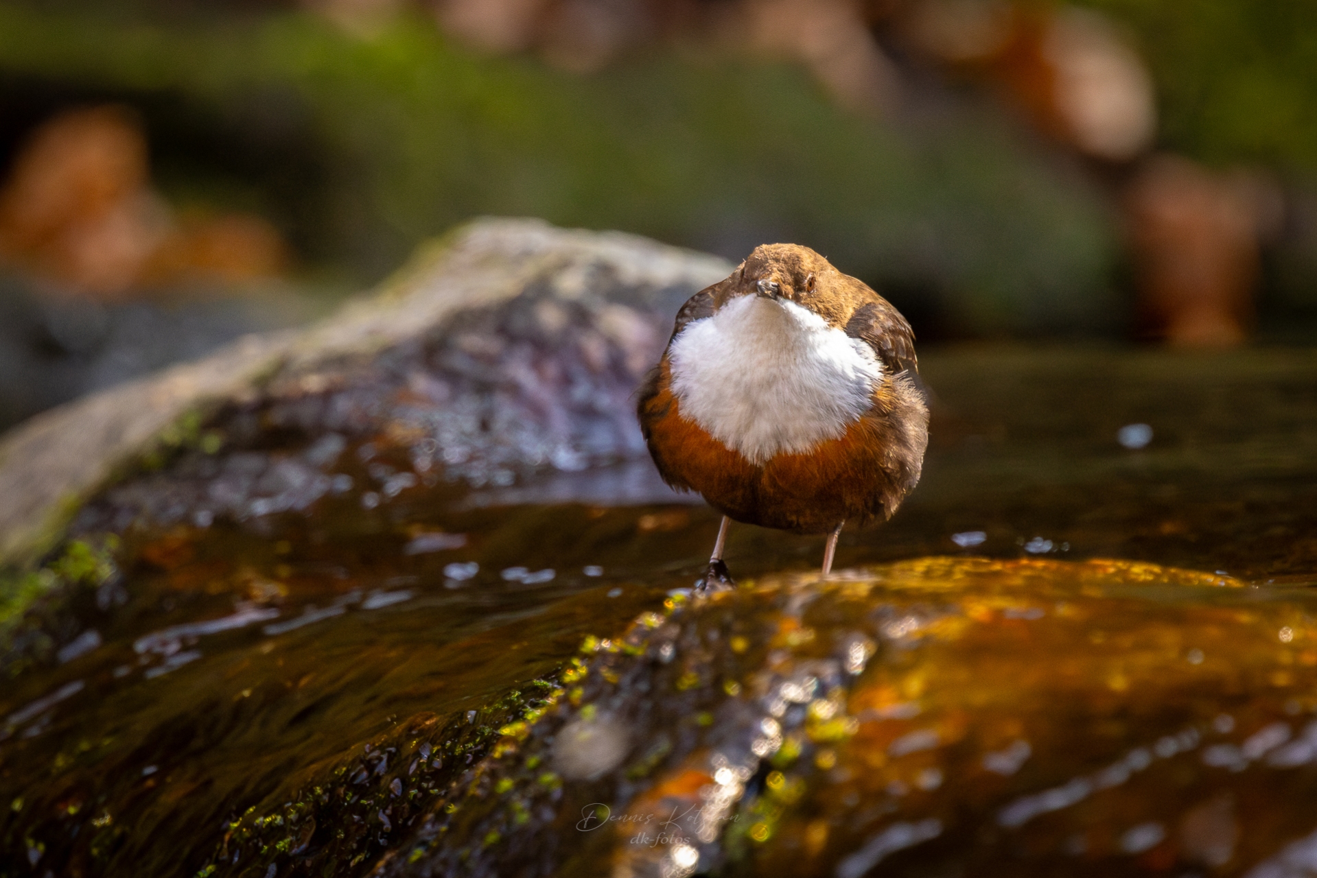Mit ihrem schokoladenbraunen Gefieder und der markanten weißen Brust ist sie oft beim „Knicksen“ auf Steinen zu beobachten. Von dort springt sie ins Wasser, um am Grund nach Insektenlarven, Köcherfliegenlarven und Flohkrebsen zu suchen.